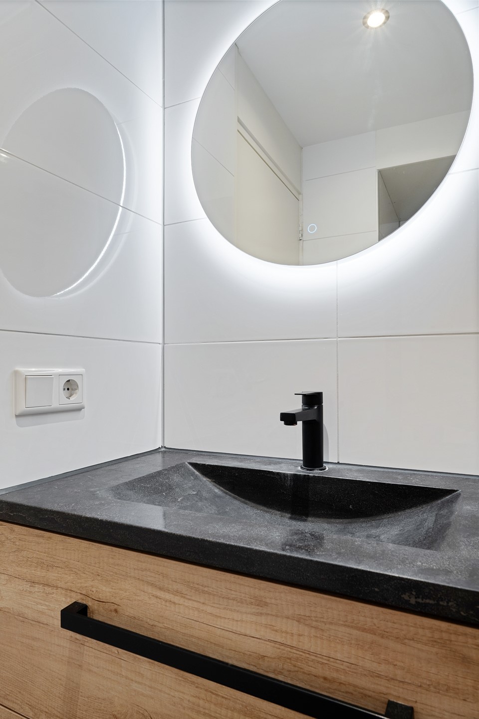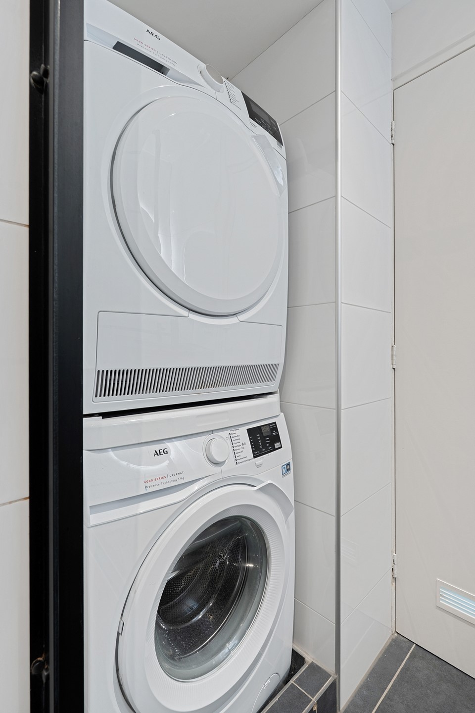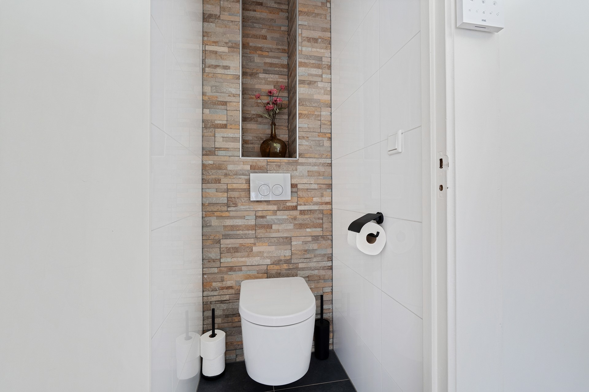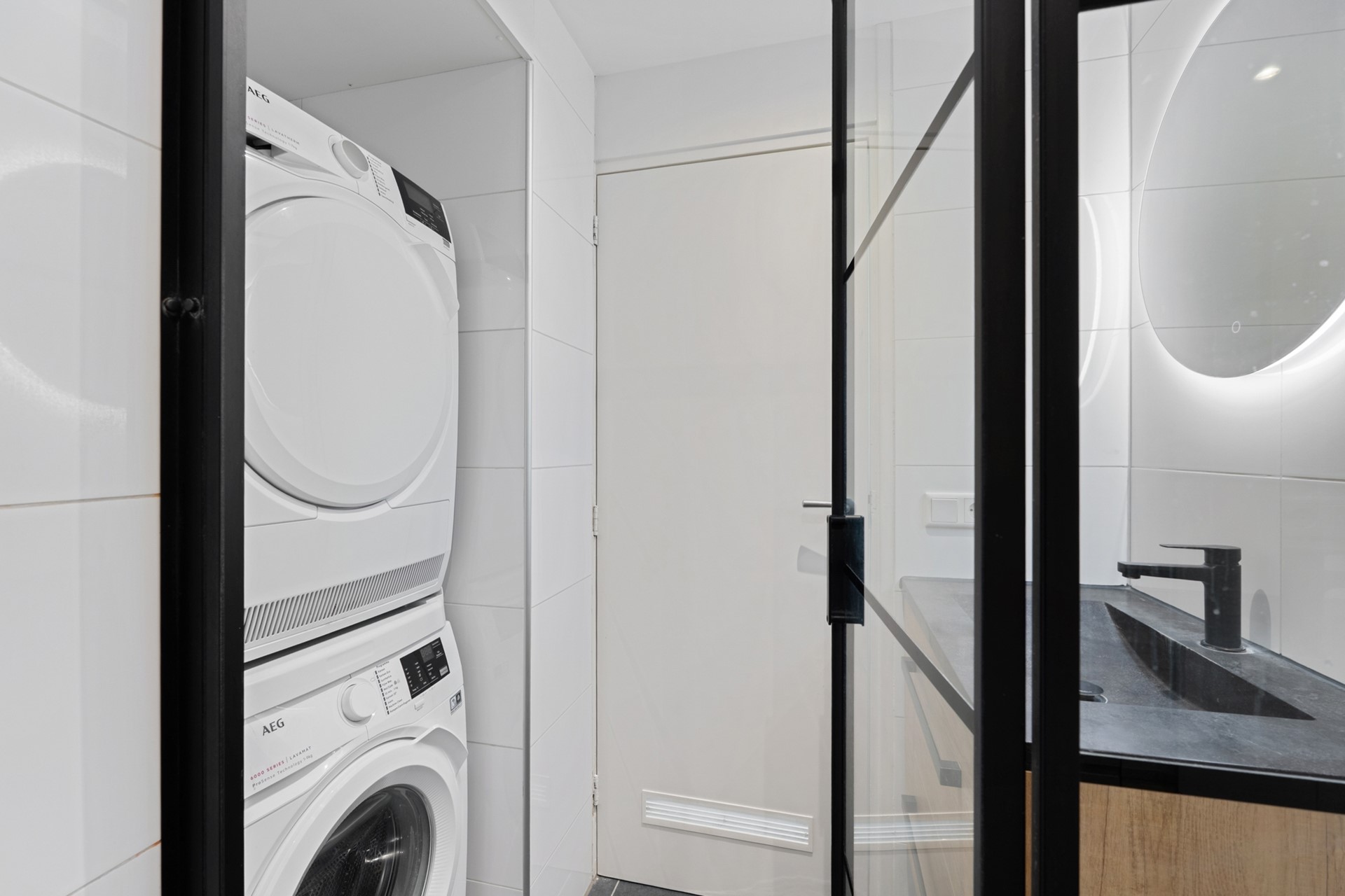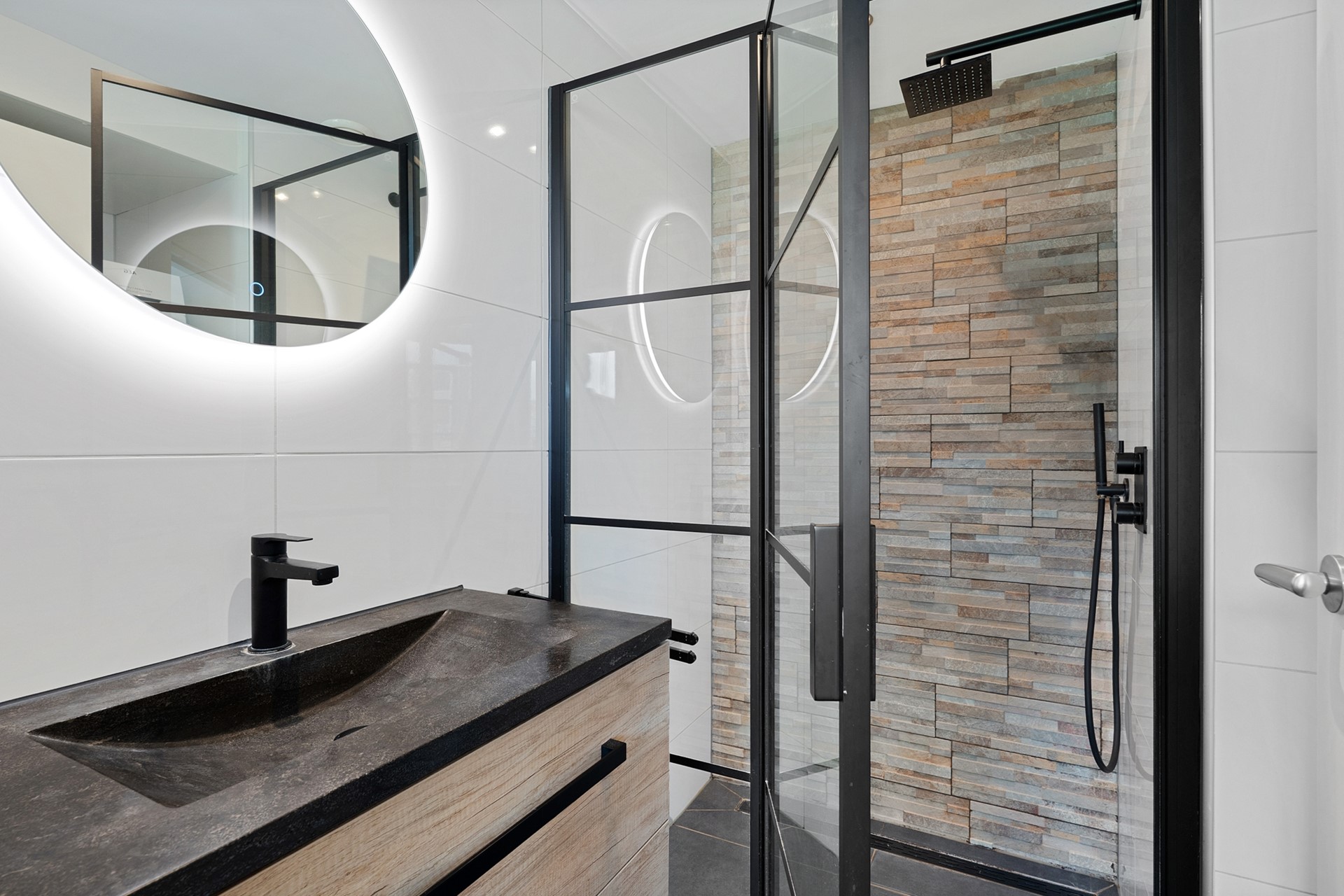 De badkamer volgt dezelfde eigentijdse stijl, met een ruime douche, fraai tegelwerk en een handige wasmachineaansluiting. Douchen wordt hier echt even je eigen spa-moment.