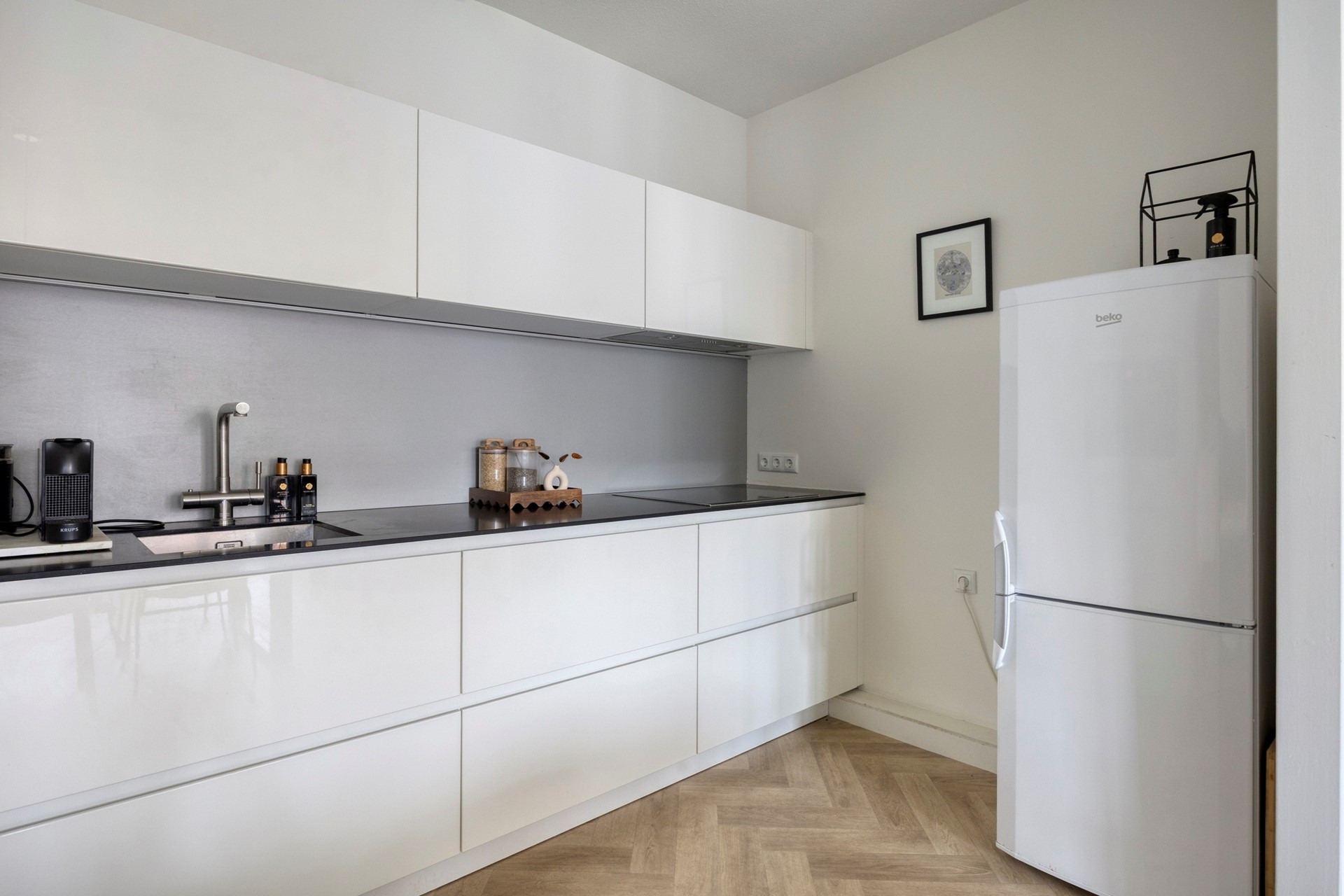 De moderne, nette keuken sluit hier naadloos op aan en is van alle gemakken voorzien. Een fijne plek om uitgebreid te koken, snel iets klaar te maken of gezellig te borrelen terwijl je gasten aan tafel zitten.